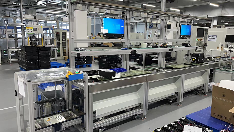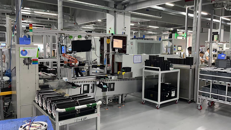 定子铁芯拼圆 → 穿套管 → 漆包线、引出线电阻焊 → 绑扎线整形 → 机壳加热 → 机壳热套 → 人 工送入冷却线进行冷却 → 人工从冷却出口取料放入倍速链...