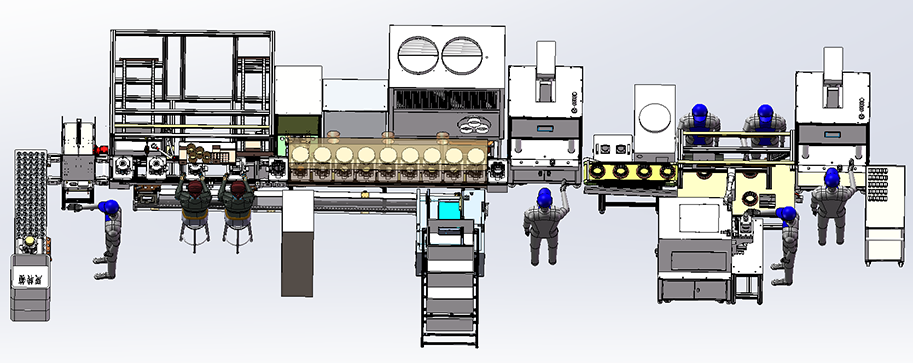 定子铁芯拼圆 → 穿套管 → 漆包线、引出线电阻焊 → 绑扎线整形 → 机壳加热 → 机壳热套 → 人 工送入冷却线进行冷却 → 人工从冷却出口取料放入倍速链工装板上 → 安装航插,安装前端盖 → 定子打销钉孔、点胶、打销钉 → 定子综合参数检测 → 人工在接驳台压芯棒并放入 工装